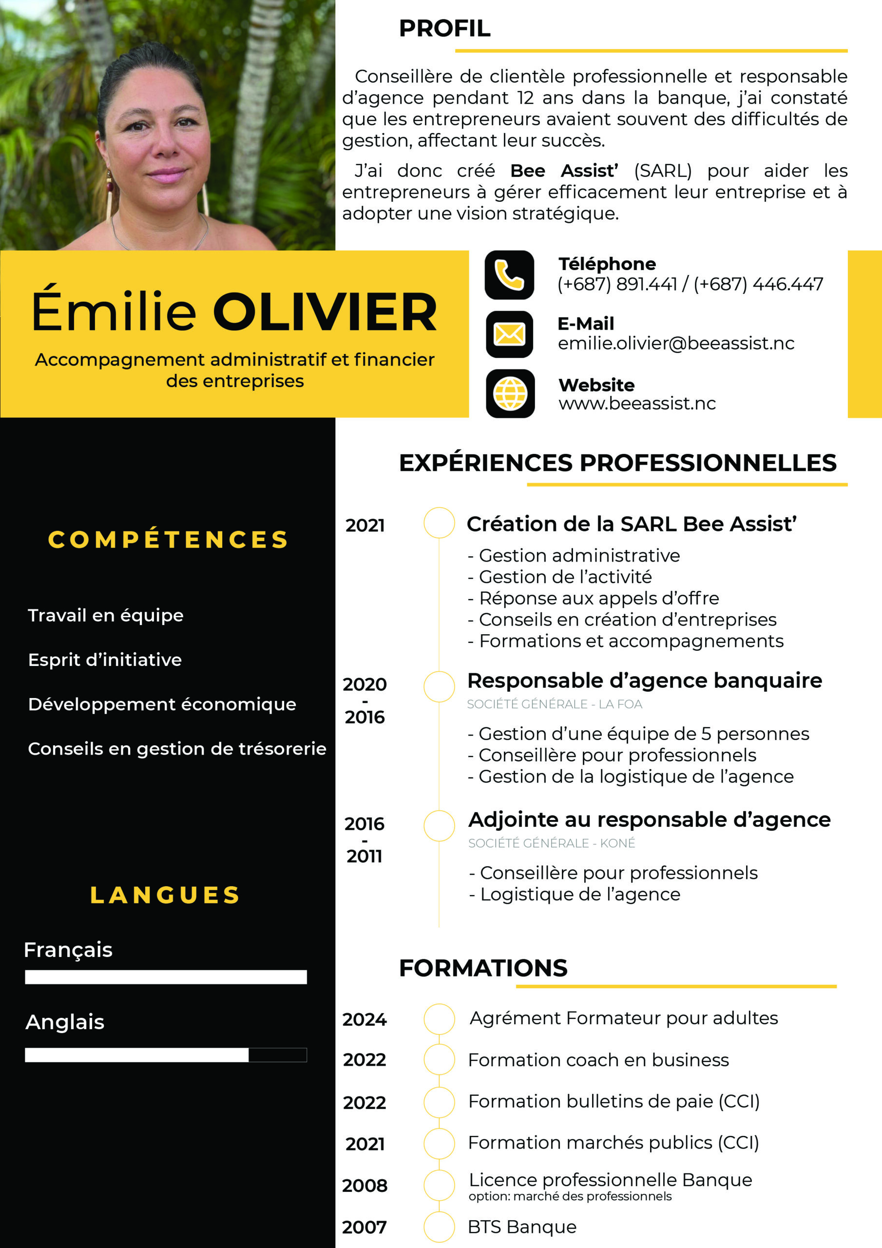 Je m’appelle Emilie OLIVIER et je suis passionnée par l’entrepreneuriat et le soutien aux entreprises. Mon parcours professionnel s’est construit sur une expérience solide de 12 ans en tant que conseillère de clientèle professionnelle et responsable d’agence dans le secteur bancaire. Pendant ces années, j’ai pu observer les défis quotidiens auxquels les entrepreneurs font face, notamment en matière de gestion administrative et stratégique. J’ai constaté que ces difficultés pouvaient freiner leur succès et la croissance de leur entreprise.